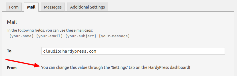 If you need to deliver the email using your domain address, you can do it through the “Settings” tab on the HardyPress dashboard, es explained in your CF7 panel: