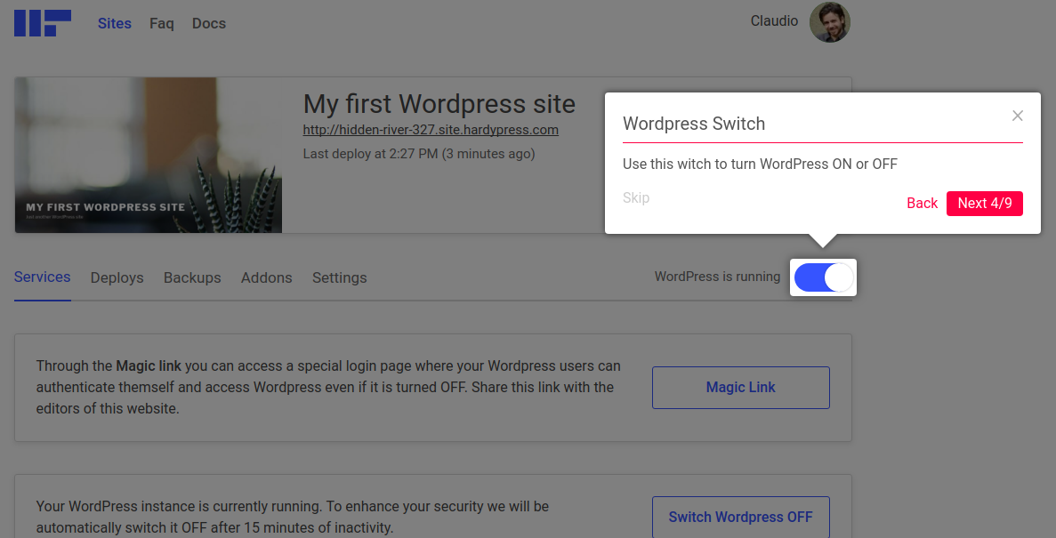 You can bring your WordPress to life or to put it to sleep with just a click. When it is turned on your WordPress is reachable through an HardyPress subdomain, something like: https://xxxxxxxxxxx-admin.hardypress.com. When it is turned off it simply doesn’t exists (no DB, no PHP, nothing at all), so you can sleep well at night.