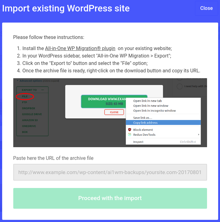 You can choose to use our FTP importer, or if you don’t want to leak your FTP credentials, you can install All-in-One WP Migration plugin® a top-rated trusted plugin (600,000+ active installs)