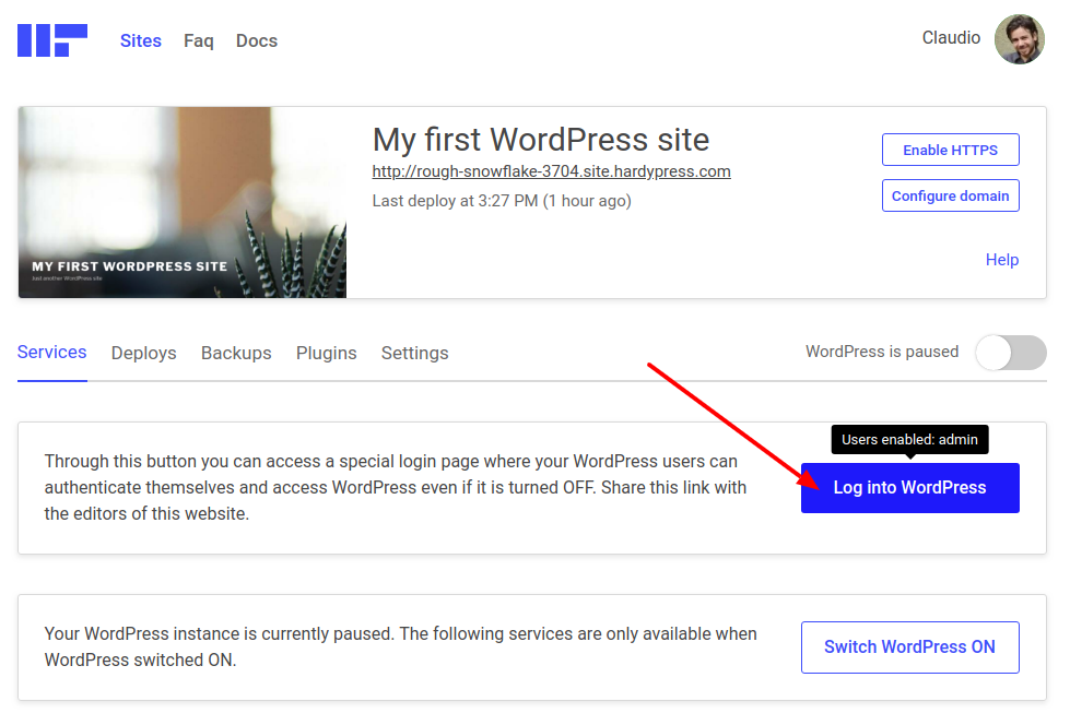 Every WordPress site on HardyPress has a special login page (we call it “HardyPress login gateway”) that can be reached even if WordPress is switched off. Think to this page as a replacement of the classic wp-login.php page, as it will looks exactly the same.