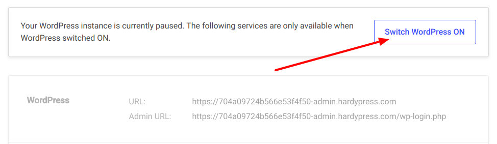 As your WordPress will be switched off most of the time, this page is always reachable on the wp-admin.hardypress.com subdomain and the URL will be something like this: