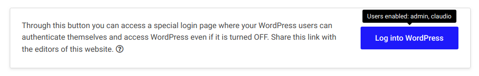 The first button “Log into WordPress” leads to a special login page, let’s call it “HardyPress login gateway”, that can be reached even if WordPress is switched off. Think to this page as a replacement of the classic wp-login.php page, as it will looks almost exactly the same, and is perfect if you want to give access to WordPress to the final client without entering the HardyPress dashboard.