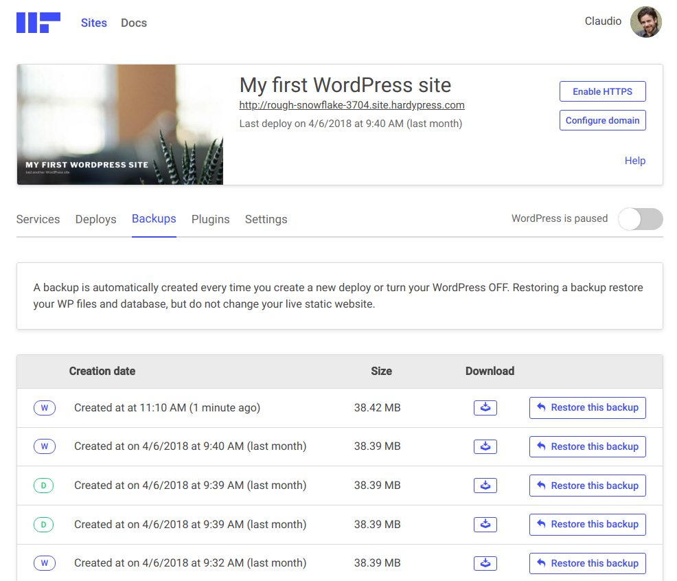 HardyPress saves snapshots of your WordPress files and database.